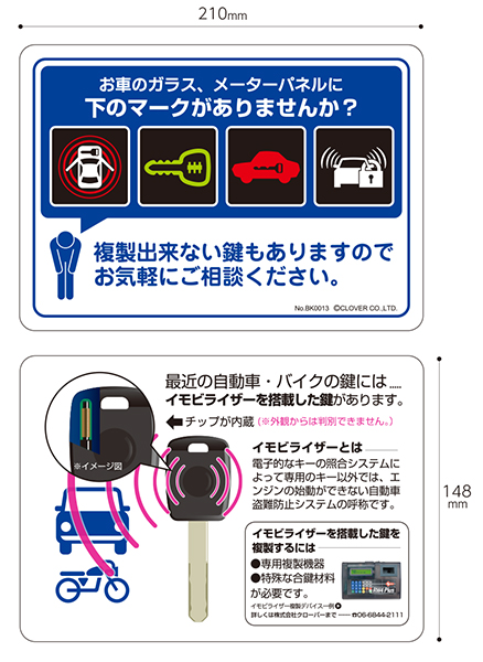 表面にはイモビライザー搭載車に記されているマーク例を掲載。裏面にはイモビライザーについての説明を掲載しています。